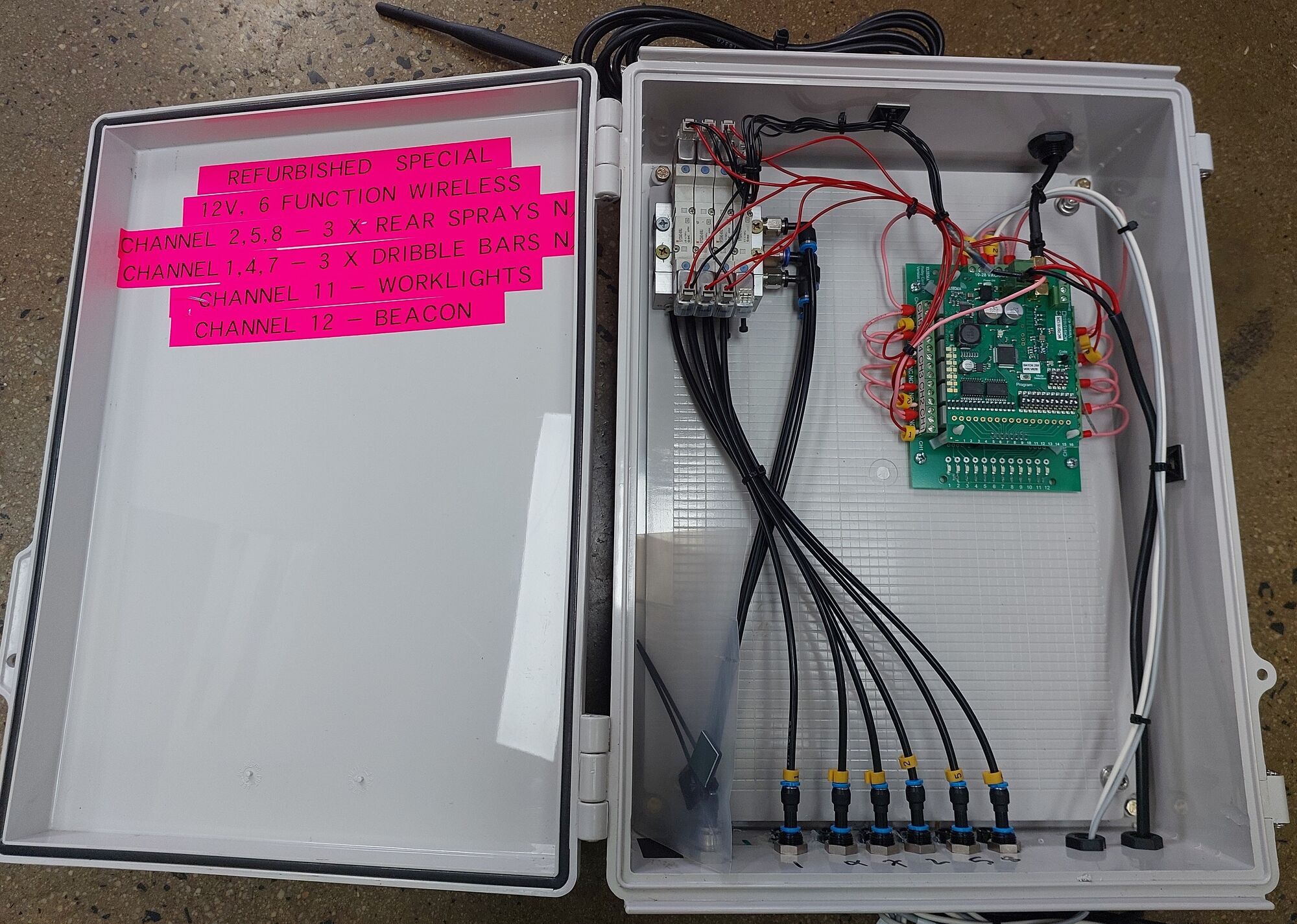 'In cab' control hand piece has eight (8) function buttons with a face plate and  a rubber sleeve (140 mm x 75 mm x 30 mm).  Electrical control cabinet has four (4) SMC solenoids mounted in weatherproof IP65 rated enclosure (360 mm x 300 mm x 150 mm) with an external power lead.  The solenoid valves, air fittings, bulkhead fittings and internal air hoses are mounted in the enclosure. Electrical wiring & airlines are numbered & channels are identified.